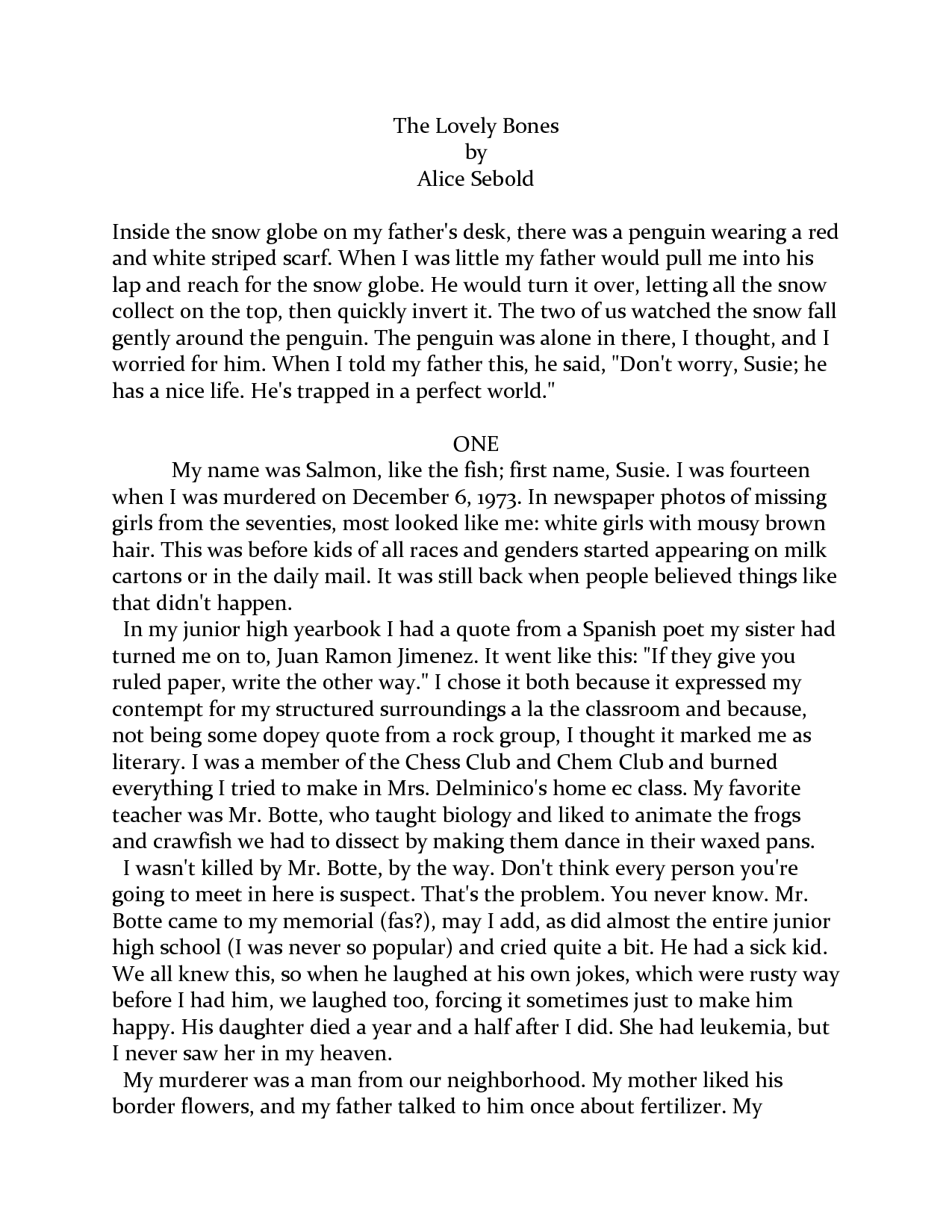 This is a spoiler page for The Lovely Bones. Inside the snow globe on my fathers desk there was a penguin wearing a redand-white-striped scarf. ISBN 0-316-6166685 The Lovely Bones is a book that is shocking and moving at the same time.